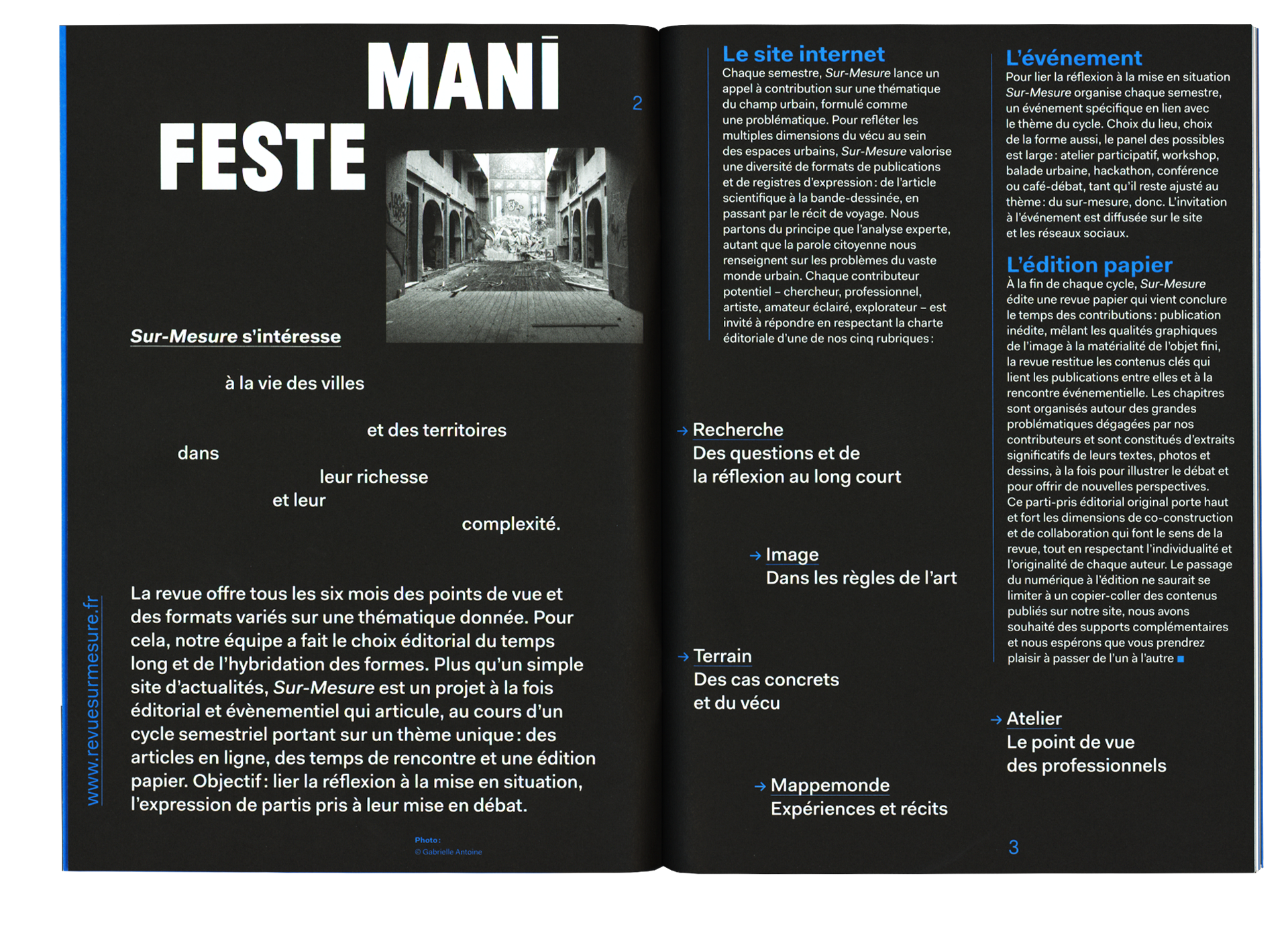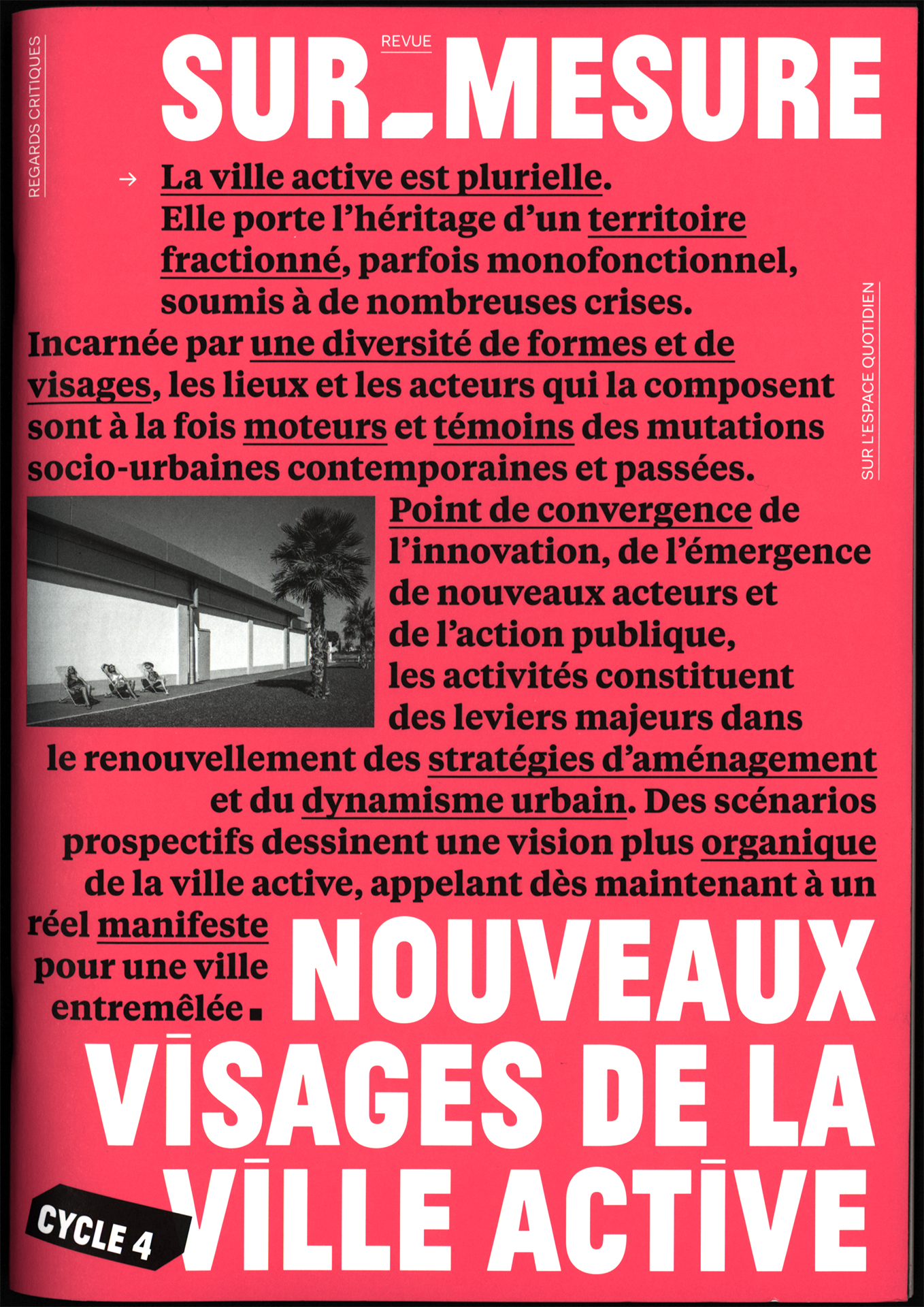 La revue Sur-Mesure s’intéresse à la vie des villes et des territoires dans leur richesse et leur complexité. La revue offre tous les six mois, des points de vues et des formats variés sur une thématique donnée.