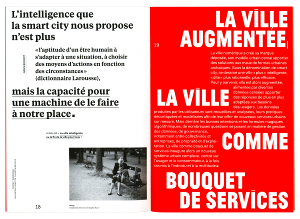 La consultation de cette édition est non-linéaire. La revue est composée d’images et extraits d’auteurs et artistes diverses. La lecture est pensée comme un parcours urbain, fragmenté, fait de détours et de changement de rythmes. Elle s’accompagne de repères textuels autour des contenus, une signalétique intérieure qui cadre l’objet et relie les différentes compositions typographiques entre elles.